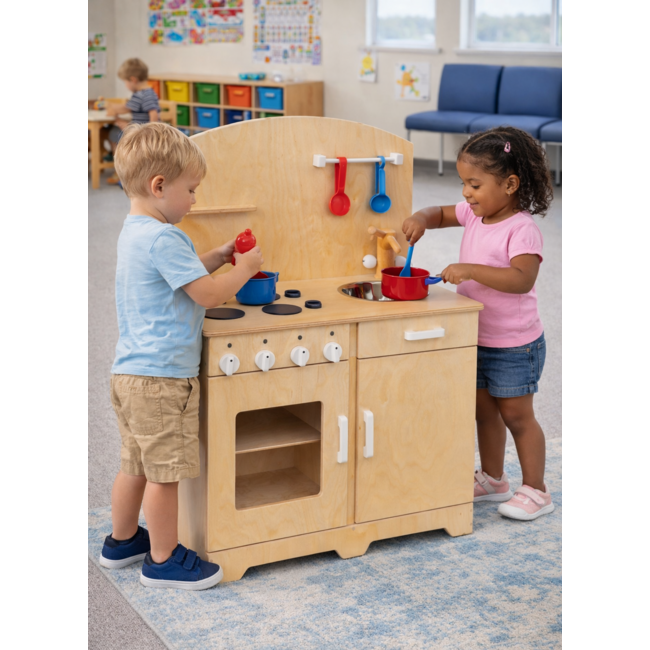 This premium quality wooden play kitchen for daycare institutions and nurseries is large enough for several toddlers or preschoolers to play at. The play kitchen features a hob and a rustic stainless steel sink including tap with cold/hot indicator. The toy kitchen also has several kitchen cabinets for storing kitchen accessories.